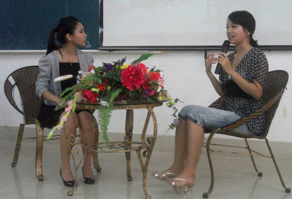 接着进入第二个环节,即优秀毕业生经验交流会。此环节是以访谈的形式展开的,访谈嘉宾为07级考研代表黄娜,她以优秀的成绩被中山大学录取,并作为我校交流生被派往美国圣约翰大学学习。访谈中播放了黄娜在美国生活的视频,黄娜也分享了她在美国学习的一些有趣经历和在考研过程中所遇到的重重困难。在互动环节中,老师与学生都积极地向黄娜提问题,她也向同学们讲述了一些关于面试学校交流生,以及考研的经历和技巧。她相信机会是留给有准备的人的,只要抓住机会,展示自己的亮点,那么你就成功了。