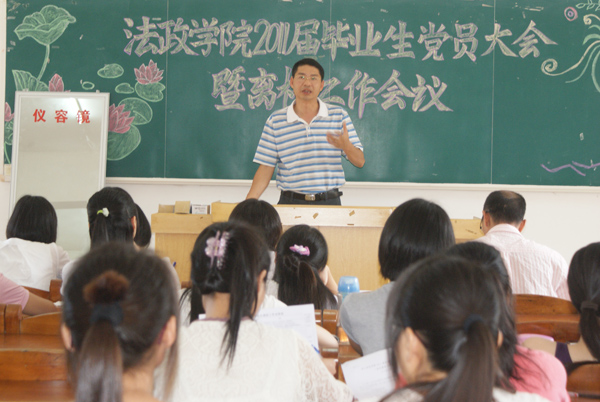 法政学院党委全柱副书记首先传达了学校2011年毕业生离校工作的会议精神。他指出,毕业生离校工作是大学教育重要环节,是关系学校稳定、建设和发展的全局性工作。学校于昨天专门召开2011年毕业生离校工作会议,特别强调了离校手续办理一站式服务等要注意的细节和事项。他强调,学院的毕业生离校工作,要按照学校党委梁英书记提出的“要高度重视毕业生离校时期的安全稳定工作,以维稳的姿态重重把关,形成氛围,加强纪律,发挥党员带头作用,关注特殊群体,确保毕业生安全、稳定、文明离校”等要求,严格去做好、开展好。