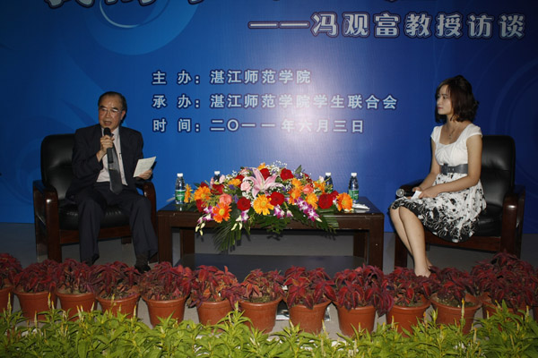 2011年6月3日,学校第四期教育名师论坛在图书馆学术报告厅举行,著名心理学家冯观富教授与我校师生一同分享了他的学习生涯,院长办公室、校团委等相关部门负责人出席论坛。本期论坛吸引了众多慕名前来的学生,尚未到7点,湛师的图书馆前早已出现了排队等候的人群。此刻他们正在盼望着著名心理学专家冯观富教授的到来。