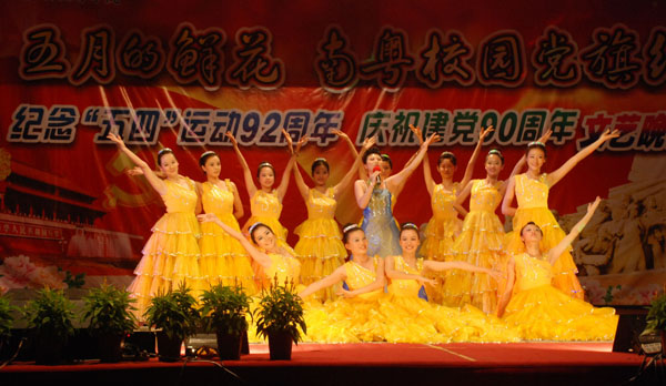晚会在生化系大合唱《革命人永远年轻》、《我的中国心》中拉开帷幕。艺术系男生三重唱的《红旗飘飘》与女生三重唱《快乐地跳吧》,以及声乐教师李雪老师的美声独唱《亲吻祖国》歌声洋溢着充沛的感情,富有艺术感染力,博得观众一阵阵热烈的掌声,展现了该院师生多才多艺的精神风貌。