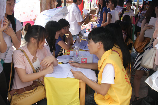 今年共有64支队伍参加统一招募活动,活动刚开始,现场就已人山人海,热闹非凡。各实践队“捕猎”各类志愿者,而志愿者则物色自己心仪的下乡队伍。今年招募有两个很大的亮点:第一,招募现场播放宣讲往年“三下乡”社会实践成果的DV,方便学生现场了解大学生“三下乡”社会实践的意义。第二,本次招募活动按照地区来划分招募区,共包括吴川市、雷州市、廉江市、徐闻县、遂溪县、市内郊区、市外省内和省外各地共8大区域,方便大学生按照喜欢的地区“对号入座”,选择合适自己的队伍。