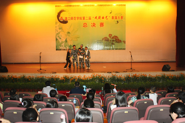 经过各个二级学院的海选,初赛和复赛的筛选,今天13支优秀的参赛队伍进行角逐。比赛伊始,一首《说唱脸谱》,融合了京剧与流行音乐,来自音乐学院的9个活泼的女生借着京剧唱腔和旋律,将我国的传统戏曲元素巧妙的融入到歌曲之中,赢得阵阵掌声;接下来,来自人文学院的2号选手以一首《雷州情》,深情演绎了对家乡雷州的热爱; 4号团队的舞台剧《西部支教》为我们诠释了一名党员和教育工作者的责任;5号团队的朗诵——《青春中国》更是激情澎湃,把我们再次带回了旧中国,点燃了每一个人心中的爱国情怀,把整个大赛推向了最高潮;另外《睡美人》、《大学校园保安》、《牵手青春》、《我的青春我自己做主》等话剧都有着各自独特的风格,为我们上演了一幕幕感人的画面。这次的“戏剧曲艺”无论是在形式上还是在内容上都有明显的创新与突破,尤其是在曲艺方面。7号选手给我们带来了扬琴独奏《欢乐的新疆》,8号团队带来了国粹戏曲《梨花颂》,10号团队带来了粤剧对唱《紫钗记之剑合钗圆》,13号团队带来了湖北少数民族经典对唱《龙船调黄四姐》。选手们载歌载舞,眉飞色舞,,一曲曲美妙的乐曲让在场的观众都听得如痴如醉。