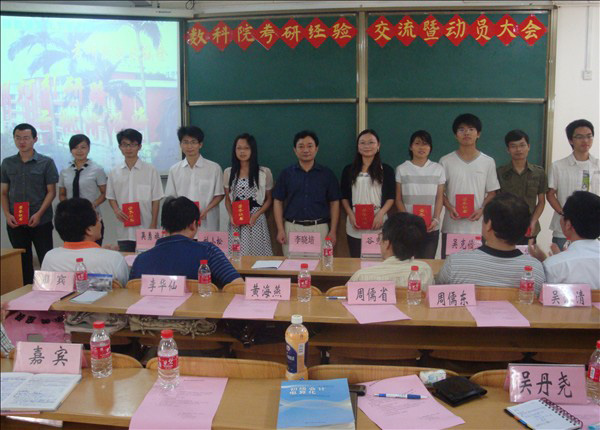 在欣赏完关于考研的视频后,李院长为考研成功的学子们颁发了奖状。随后, 6位考研成功的师兄师姐们上台分享了有关担任干部的经历对考研的影响,如何制定考研计划,合理分配学习时间等方面的考研经验,以及学习数分、高代、英语与政治的方法与技巧。在互动环节中,同学们就如何选取辅导书和报考辅导班、得到所报院校的信息等方面询问了师兄师姐们,并得到师兄师姐的耐心回答。