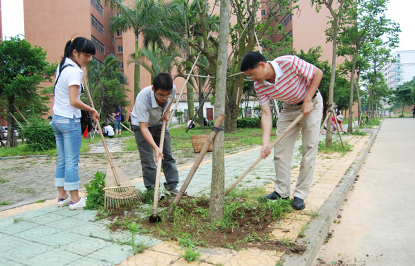 湛师新闻网5月25日讯 为有效推进“两进三同”活动,5月23日下午,法政学院党委全柱副书记和08思政4班的全体同学一起到到雷阳区绿化草地开展清除杂草活动。