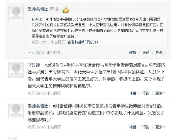 “看今天的微博了吗?”这句话已成为了我校学子这段时间的问候语。微博在广大青年学生中非常流行,我校共青团紧紧把握时代脉搏,响应青年诉求,以“两进三同”为载体,以李江凌副院长深入开展“两进三同”为契机,在团委的官方微博中开出了“对话信仰——李江凌副院长与千名青年学生微博面对面”活动,邀请李江凌副院长作为团委的官方微博“对话信仰”的话题主讲嘉宾,与青年学生对话信仰,一石激起千层浪,短短几天,李江凌副院长发出的“对话信仰”的帖子后,已收到了上千条的回复与转播。