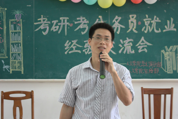 湛师新闻网5月23日讯 为了加强学风建设,进一步提升人文学子的综合素质,使有意向考研、考公务员的学生明确方向,尽早制定计划,增强信心,积极准备,通过努力实现理想。22日下午,人文学院团委学术调研部在弘雷楼107教室举办了考研·考公务员·就业经验交流会,人文学院冯基聪副书记和辅导员谢明亮老师出席了交流会。