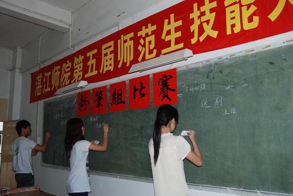 比赛前期,各二级学院通过层层的选拔推举出本学院内的精英选手,他们或是擅长钢笔书写、或是擅长粉笔板书、或是擅长毛笔泼墨、或是三项皆通。他们带着傲人的实力,登上“三笔字”精英赛的舞台,一展风采。在主持人介绍完比赛规则后,毛笔字在雷阳广场、粉笔字于教二107教室同时进行。粉笔字比赛的选手分为每三人一组,从所给唐诗中抽取题目并书写于黑板上。小小的粉笔在同学们的手中轻舞飞扬、飘逸洒脱。选手们聚精会神比赛,使出浑身解数,如八仙过海、各显神通。参加毛笔字比赛的选手在比赛过程中犹如一场笔墨飞扬的表演,他们的作品或磅礴大气,或清秀俊丽,或气质敦和温厚、骨坚内润,或雍容大方、舒展开阔,或端正俊丽、圆转流美,或运笔纯正、雄健有力。正所谓字如其人,每一幅作品无不展示着选手们的过人风采。当毛笔字比赛结束以后,作品悬挂在教二小舞台上面进行展示,吸引了大批湛师学子的驻足欣赏。此外,参加业余书法组比赛的优秀作品也在小舞台下方进行了悬挂展示,虽然是业余爱好者的作品,但是从可观性以及质量上看,他们的风采不输专业组的选手。
