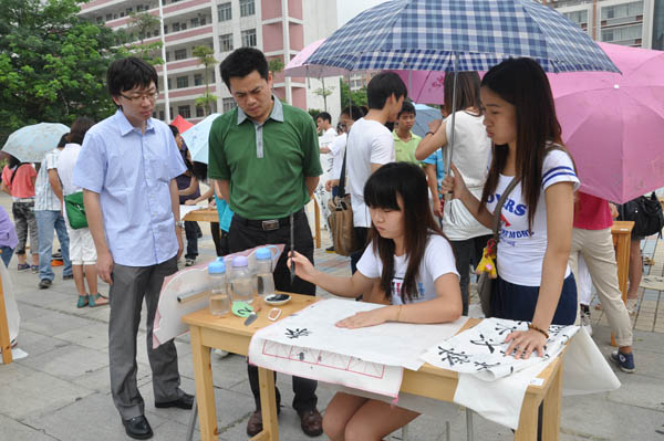 湛师新闻网5月17日讯 为更好地传承“勤教力学,为人师表”的精神,调动学生练习“三笔字”的积极性,提高从师任教的技能,由校团委,校学生会主办,信息科学与技术学院宣传委员会和法政学院宣传中心协办的我校“动感地带杯”第五届师范生技能大赛之三笔字大赛暨第十七届“三笔字”精英赛于5月15日上午在雷阳广场举行。人文学院的宋立民教授、党委宣传部关天冲科长和法政学院卓大老师担任本次大赛的评委。校团委李粤书记、莫然老师参加了活动。宋立民教授为比赛开幕式致辞宣布比赛的开始。