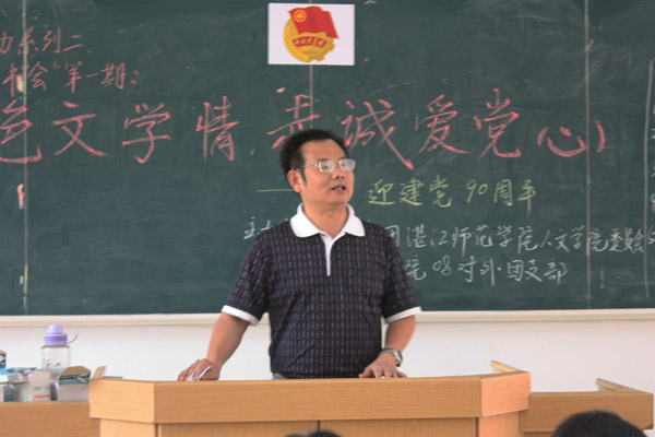 湛师新闻网5月14日讯 为了迎接建党90周年,今天上午,共青团人文学院委员会携手该院08对外汉语班团支部,在弘雷楼202教室举办了精品团活动系列二暨人文学院“周末读书会”第一期“红色文学情,赤诚爱党心”。该院党委谢应明书记出席了本次活动。