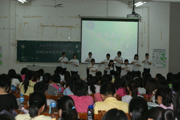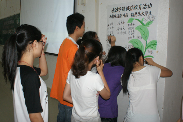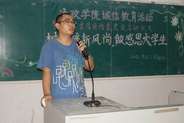 树诚信新风尚,做感恩大学生。活动伊始,何老师对大学生建立信用档案的重要性进行了讲话。他说到,大学生信用档案建设工作已经过多项试点,学院也于今年4月份开展;它作为一种信用凭证,对于同学以后的学习就业都有很重要的影响。何老师还说,大学生信用档案一旦建立,将会长期有效,所以希望同学们积极重视,认真对待。作为信用建设的一个重要部分——诚信贷款需要同学们首先树立榜样,作出承诺,接受监督。
