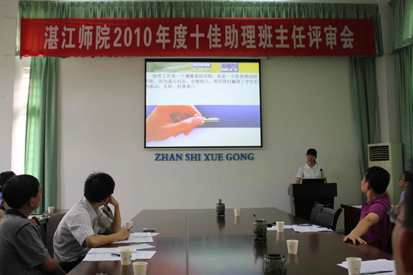 湛师新闻网5月11日讯 5月6日下午,我校2010年度十佳助理班主任评审大会在紫荆楼三楼辅导员教育培训室举行。学生处黄达海处长、赫云鹏副处长,各二级学院党委副书记等出席评审会并担任评委。