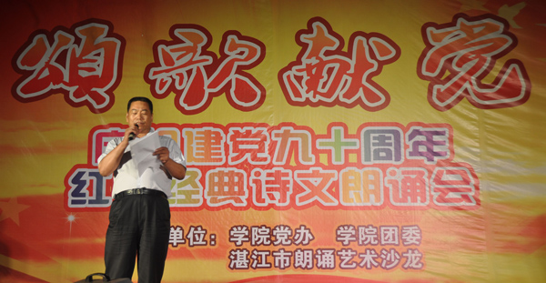 湛师新闻网5月9日讯 为庆祝建党90周年,湛江市语委办副主任、广东省普通话测试员陈劲老师率湛江市朗诵艺术沙龙协会10名会员连同湛师基础教育学院朗诵艺术团联合举办“颂歌献党”——庆祝建党90周年红色经典诗文朗诵交流会。