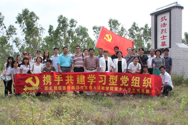 湛师新闻网5月9日讯 为了深入开展创先争优活动,共建学习型党支部, 5月6日,图书馆信息特藏部党支部与法政学院第18学生党支部教工、学生党员约25人,到湛江市坡头区开展了以“寻觅抗法足迹,激发爱国情怀”为主题的共建党日活动。校图书馆副馆长洪伟新、韦文辉,法政学院历史系党支部书记景东升博士参加了活动,坡头区区委书记梁必志、教育局局长冯主振等领导接待我校师生一行。活动由图书馆信息特藏部党支部书记邹华老师主持。