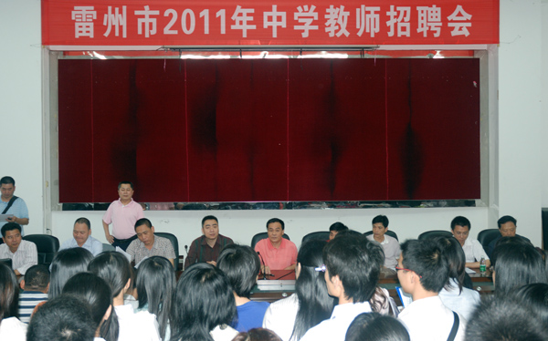 湛师新闻网4月21日讯 昨日上午,雷州市2011年中学教师招聘会在我校弘雷楼多功能室举行。雷州市委常委、教育局局长林涛,雷州市委组织部副部长、人社局局长钟勇,雷州市纪委副书记、监察局局长梁团,雷州市人社局陈兄副局长、雷州市教育局林贤副局长,以及雷州市一中、二中、三中等22所中学的校长、主任、教师参加了招聘会。我校招生与就业处李博副处长、就业市场与信息开发科李梓科长出席了招聘会。