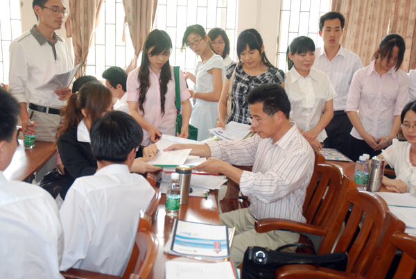 接着,陈兄副局长和林贤副局长分别向前来应聘者提出本次招聘会的各项具体要求。陈兄副局长表示,今年第一站教师招聘会选择在我校举行,往届我校毕业生在各中学中表现优秀,为我校树立了口碑和荣誉,希望应届生们要向师兄师姐们学习。另外,林副局长表示,本次招聘一改往年的招聘方式,变为现场招聘学校派代表老师与应聘者面对面交流面试,希望变革的招聘方式能物色到优秀的教师为各个学校带去新鲜血液。