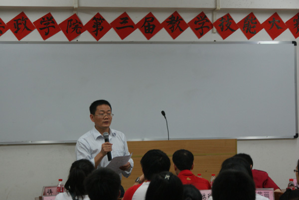 随后,谌焕义教授进行了点评总结。他认为这次比赛对提高同学们的教学技能有非常重要的作用。通过比赛,同学们可以加深对教材的把握和理解,提高自己的口头表达能力和舞台驾驭能力。此外,他还指出了不同选手之间的差异,并提出了宝贵的指导意见。