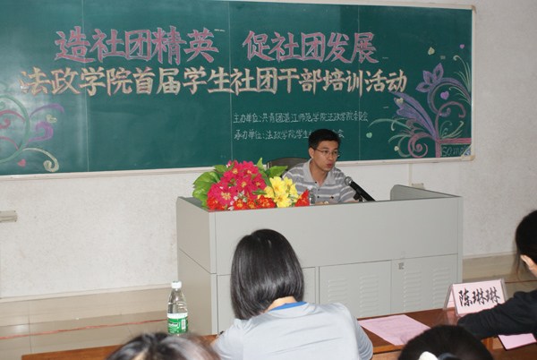 湛师新闻网4月20日讯 近日,法政学院学生社团联合会分别在弘雷楼205教室和雷阳区体育训练馆门前开展了首届社团干部培训活动。活动分为专题讲座和户外素质拓展两个部分进行。