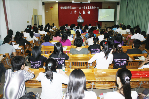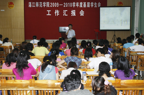 湛师新闻网4月18日讯 4月16日晚,在各层学生干部的共同努力下,精心筹划的“2009-2010学年度基层学生会工作汇报会”终于在学生活动中心四楼学术报告厅拉开了帷幕。校团委李粤书记、莫然老师以及各基层学生会指导老师、各基层学生会部长级以上干部和同学等出席了汇报会。