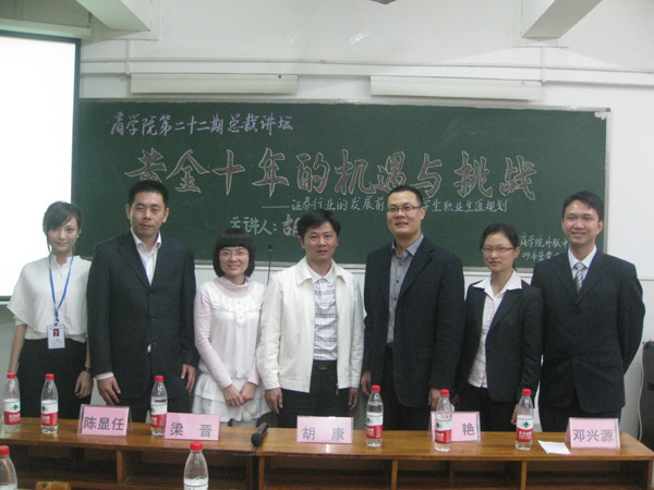 湛师新闻网4月13日讯 近日,由商学院外联中心主办、09市场营销党支部协办的第22期总裁讲坛在燕雷楼606室举行。广发证券湛江营业部总经理胡康主讲了题为“黄金十年的机遇和挑战——证券行业的发展前景与大学生职业生涯规划”的专题讲座。商学院党委梁晋副书记,广发证券陈显任经理、杨艳经理、张立民经理、邓兴源经理和吴婷小姐等出席了讲坛。讲坛由商学院辅导员张彦老师主持。