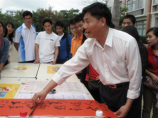 9日上午,“三笔字”大赛于雷阳楼正式拉开帷幕。教科院党委王列盈书记,美术学院刘宝光教授,继续教育学院张康灼老师担任本次大赛的评委。参赛选手首先在咏雷楼106室进行粉笔字的比拼,之后,各选手移步到雷阳楼门前进行钢笔字及毛笔字比赛。各选手根据自己抽选的内容,认真临摹,充分发挥水平。其中,精彩的毛笔字比赛吸引了大批同学的围观。选手们充分发挥自己的创意,根据自身风格进行创作。书写内容有成语,对联,诗词,短文等形式。在选手完成比赛后,各评委进行评分及点评。期间,王列盈书记表示:“要写好毛笔字,必须吸收民间的精髓,不仅要把个别字体写好,更要学会整版地临摹,在此基础上写出自己的风格。”刘宝光教授也表示:“三笔字大赛是教科院的特色项目,尤其是近年来,选手们的水平稳中有升,希望大家能继续努力。”赛后,三位评委分别即兴挥毫,并与全体选手合照。