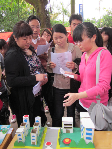 与此同时,现场手工制作大赛也于雷阳楼门前如火如荼的进行着。担任本次比赛的评委分别是教科院白彦茹教授、曾茂林副教授、石梦良老师。比赛历时两个多小时,参赛选手以设计符合平时教学的“教具”为标准,各施所能,通过组织、选材制作与教育教学相关的、易于孩子动手操作或演示的教具。赛后白彦茹教授表示参赛作品体现了直观性、示范性、实用性和环保性等,符合小学生的认知心理特点,并指出,教具设计应充分与教材结合、与课堂结合,具有操作实用性。