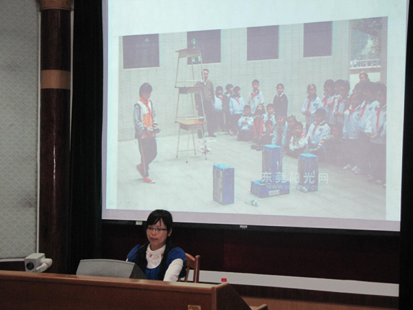 讲座上,吴景婵老师以“知己知彼”作为开场白,她首先通过“知彼”介绍当前东莞地区政府对中小学生的科学素养培养情况,其中包括科技场地的建设逐步完善、资金的大力投入、社会家庭高度重视等方面,同时介绍东莞中小学科学课程的设置和 “三模一创”科技活动开展情况。再次,她结合“三模一创”科技活动开展情况讲解了当前东莞中小学对科学老师的师资要求,告诉同学们大学期间要针对性的提高科学教育的专业知识水平,为以后的工作开展奠定好基础。吴景婵老师整个讲座通过精彩的PPT、精美的实物科技作品展示、和生动的语言感染和鼓舞了在场的每一位同学。在互动环节,同学们踊跃的发言和吴景婵老师深入交流,现场不时响起听讲学生的阵阵掌声。