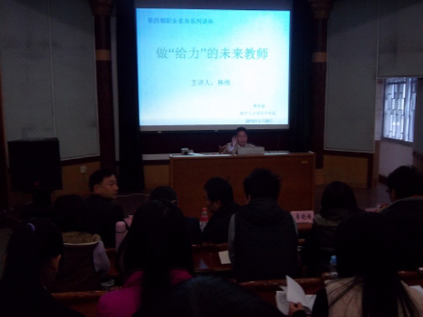 上午,在题为“做‘给力’的未来教师”讲座上,林老师以一个关于他从教20年来获得的奖项的视频拉开了本次讲座的序幕,并从中提出每个人的发展都有一个过程的观点。期间,林老师从“独立、创新、宽容、超越、负责、快乐和人格魅力”等七个方面介绍了作为一名教师应具备的品格。其中,他还多次强调读书的重要性,他认为,读书要明确自己的优势和方向,善于整合和积累,并利用现代的多媒体、图书馆的资源来博览群书,开拓视野。