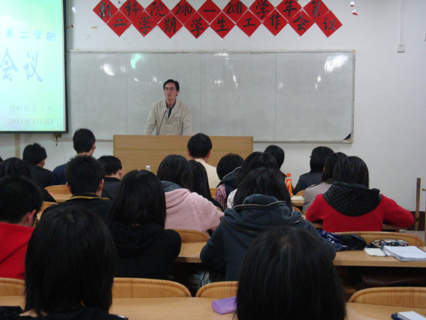 湛师新闻网3月6日讯 昨晚,数科院在榕燕楼301教室举行2010-2011学年第二学期学生工作会议。数科院党委唐洪浪副书记、辅导员全光华老师出席了此次会议。
