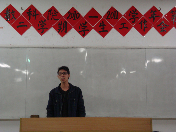 最后,全老师总结了上学期学生的工作,并向大家说明了主要干部与部级干部的区别。公布了数科院上学期的获奖情况:综合技能大赛与诗文朗诵都获校级一等奖等在体育类、文艺类方面所取得的良好的成绩。他还希望数学文化节能结合自身专业,增加一些数学元素。