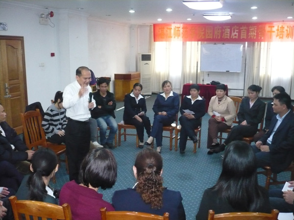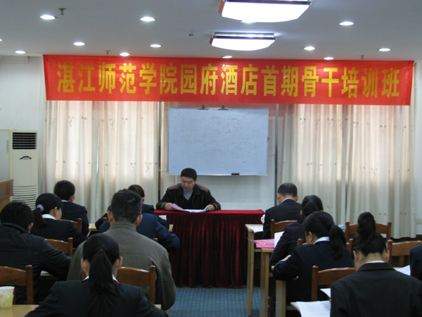在本次培训班上,园府酒店凌贤郅经理首先和全体班组长学习了罗海鸥院长和李永全副院长在2010年后勤产业总结表彰会上的讲话精神,鼓励全体管理人员继续发扬勤勤恳恳、任劳任怨、默默无闻、无私奉献的高尚精神和质朴品质,提供优质服务。随后围绕新的一年如何进一步做好学校的接待工作和业务开拓两大主题,提出了新要求、新措施、新目标,要求全体管理人员在新的一年里以良好的精神面貌、踏实的工作作风,扎扎实实把各项经营管理工作做好,展现良好的风貌,为学校的接待服务工作做出新的贡献。