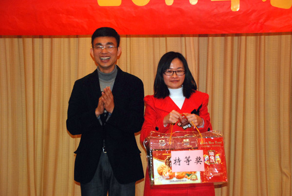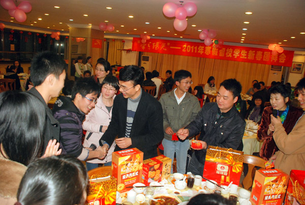 据了解,学校每年都会举行留校学生团拜会,让留校学生充分体会犹如在家过年一样的幸福和快乐。今年,新春团拜会在学生处的精心组织和筹备下进行得更为热闹和喜庆,无论是新年致辞和歌舞表演,还是抽奖环节和派发利是,在场的同学们无一不受鼓舞和感动。当晚抽到特等奖的陆华娣同学来自生科院07生本班,因为她拿到的抽奖号码刚好是001号,也正是这一幸运号码带给她新年的最大惊喜,她说能抽中特等奖特别开心,而且能在学校里和老师同学们共度春节,感觉就像在家一样温馨,她更希望自己能借这份新年好运在来年找到一份好工作。