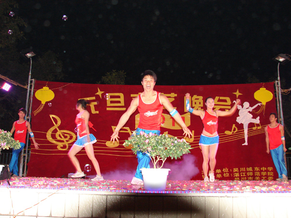 我校同学精心准备了健美操、舞蹈、武术、歌曲等节目,同学们的精彩演出,给城东中学的师生带去一顿丰富的视听盛宴。城东中学的张校长称赞我校学生素质高,表演的节目很精彩,使城东中学两千多师生欣赏到了高水平、高质量的演出,他代表吴川城东中学对我校演出表示感谢。
