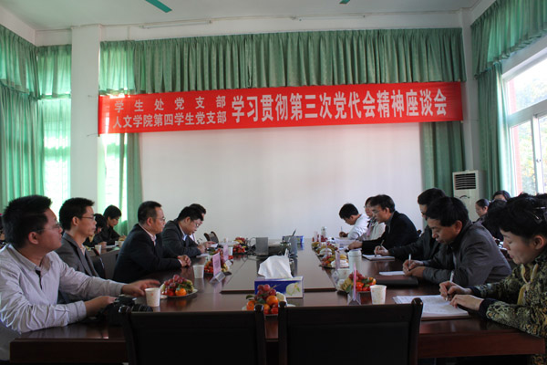 湛师新闻网12月28日讯 为了让党员师生更好的深入学习我校第三次党代会精神,认真落实党代会提出的各项任务,12月26日下午,学生处党支部与人文学院第四学生党支部于紫荆楼301室召开了以“学习贯彻第三次党代会精神”为主题的座谈会。我校李江凌副院长、学生处黄达海处长、人文学院党委谢应明书记等领导,以及学生处党支部、人文学院第四学生党支部全体党员参加了座谈会。会议由学生处党支部书记黄达海主持。
