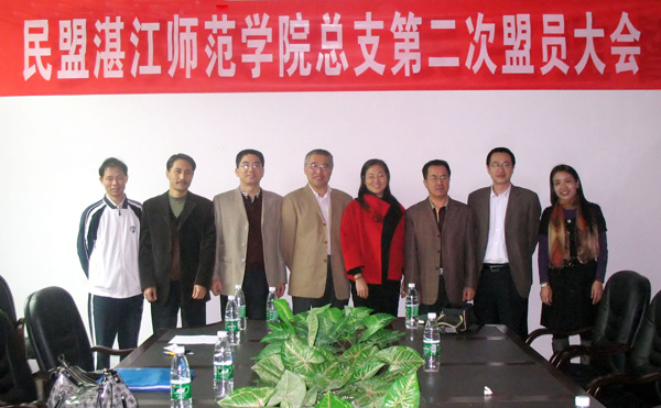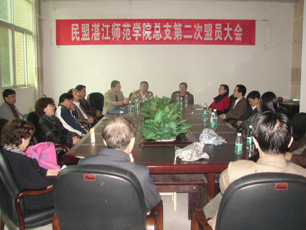 学校党委统战部副部长李健彬在会上讲话。他说,我校民盟总支自成立以来,在参政议政、建言献策、民主监督等方面工作发挥了重要作用,为学校的教育事业和湛江市经济发展作出了应有的贡献。他希望:一承接光荣历史,开创辉煌未来;二充分发挥优势,推进学校各项事业的科学发展;三、加强班子建设,增强班子战斗力。