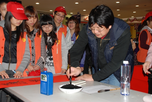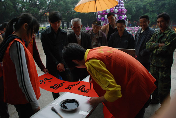 据悉,美术学院自2005年元旦开始,就根据该院专业特色组织学生在湛江市内开展“元旦义务送春联”志愿服务活动,2008年后,在活动中专门开展对书法专业课题调研,09年把加入民俗文化“剪纸”项目,今年添加书写廉政对联项目。