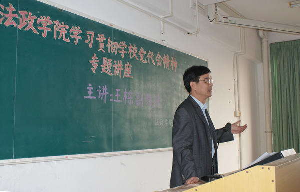 湛师新闻网12月23日讯 昨天下午,法政学院在弘雷楼503室召开有关学习贯彻学校第三次党代会精神的专题讲座。王栋副院长担任主讲。讲座由该院辅导员陈明娟老师主持,该院全体党员参加了本次讲座。