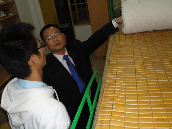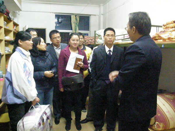 在与同学们亲切的交流中,熊院长又询问了新生的家庭状况和学习情况,嘱咐他们要好好学习,学好专业,打好基础,好好复习,以最好的状态迎接即将到来的期末考试,不要受到冷空气的影响。工会陈宗林主席看到她担任班主任的10中本4班的几位女同学,衣着单薄,连连叮嘱她们找时间到她家去挑一些厚衣服。冯基聪副书记和赵金钟副院长在走访过程中,看到许多学生现在尚是睡竹席,盖薄被时,也不断叮嘱同学们要注意身体,预防感冒,并连连称赞同学们能吃苦耐劳。每到一处,他们都叮嘱同学们有困难及时向学院领导老师反映,并承诺尽力解决。