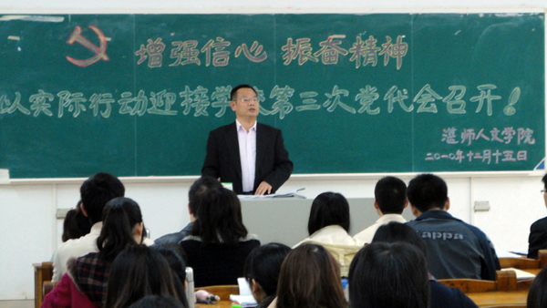 湛师新闻网12月15日讯 今天下午,人文学院在弘雷楼207教室召开主题为“增强信心,振奋精神,以实际行动迎接学校第三次党代会召开”的动员大会。人文学院党委谢应明书记、冯基聪副书记、副院长刘惠卿博士、辅导员黄河、谢明亮、詹绍姬、张家波老师以及学生党员参加本次大会。