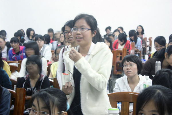 讲座伊始,刘小红老师概括了大学生必备的一些能力,包括专业知识能力,计算机应用能力,信息文献检索与获取的能力和语言文学的驾驭能力。接着刘小红老师从美的认知人性的领会、美的发现学会欣赏美和提升品位追求诗意智慧的人生三方面对文学写作的魅力进行了阐述,并以“散文诗是我的心灵鸡汤”为核心,旁征博引,生动地讲述了自己和散文诗结缘的故事。刘小红老师认为自己有三样宝:书香、真情和打开图书馆的金钥匙,并在讲座过程中多次声情并茂地朗读自己或名家的散文诗,每次都得到同学们雷鸣般的掌声。随后刘小红老师从散文诗的定义、散文诗的美学特征等方面诠释了散文诗,期间她还对黎巴嫩诗人纪伯伦的散文诗《沙与沫》和泰戈尔《新月集》、《飞鸟集》中的小诗进行了细致的鉴赏。刘小红老师还借用席慕容的“每个人心灵深处都有一扇通往诗国的门窗,能否被开启,能否成为诗人,要看机遇,在什么时候,由谁来叩响,只能凭你的心灵把握,当你的心灵被叩响的时候,勇敢地打开它吧,你一定会看见那条美丽的通往诗国的门径”来鼓励大家。讲座长达两个小时,在互动环节中,同学们就“如何写好散文诗”等问题提问,刘小红老师都一一耐心回答。