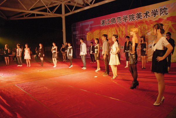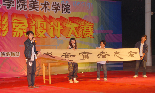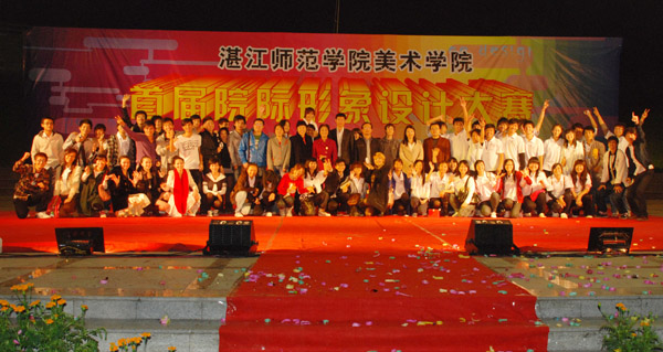 湛师新闻网12月12日讯 为广大同学提供一个展示自我平台创建校园精品文化。昨晚,由美术学院学生会主办,美术学院学生会外联部承办,金品广告、合生地下城赞助的美术学院首届院际形象设计大赛在寸金广场举行。出席本次大赛的有美术学院党委李爱群书记、林志军副书记、辅导员谢圣明、黄钰晶,赞助商合生地下城李贤在先生、陈兴金先生及各个二级学院主要学生干部。学生处贷款中心主任谢巧云老师、博雅中心办公室主任刘淑芬老师、美术学院何远敬老师、刘启红老师担任本次大赛的评委。