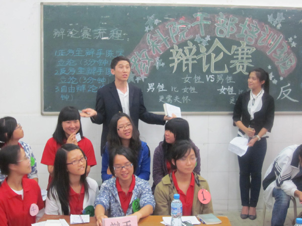 第三轮的嘉宾辩论赛由各机构女联队与魏珂老师组成的正方和各机构男联队与卢建筠博士组成的反方围绕“男性比女性更需要关怀“还是”女性比男性更需要关怀”展开激烈辩论。正反双方辩手追根溯源,旁征博引,卢博士、魏老师和学生干部辩手们的妙语连珠,不时赢得在场干部的掌声和喝彩声。