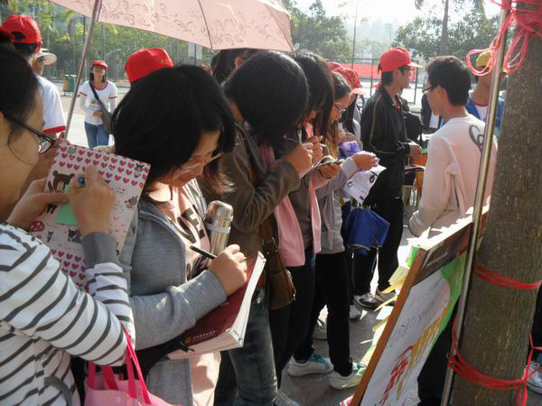 志愿者们在现场以火灾视频和新闻报道为同学讲解上海“11.15”特大火灾的相关情况。同时,通过发放宣传单向同学们宣讲安全防火措施。并让同学们在横幅上签字。
