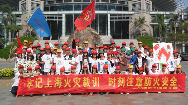 湛师新闻网12月5日讯 “11.15”震惊了我们,为了提高和加强学生安全防火意识、消防知识。昨日早上,我校物理学院共青团领导10机电2团支部在体育馆前,举行了以“寄心上海住宅火灾,提高宿舍防火意识”为主题的安全意识宣传活动。