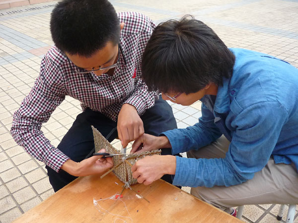 大赛主要分为现场创作和现场解说两部分。参赛者都以多人组合形式参赛,现场选手挥舞着报纸、胶布、纤维绳等工具进行组合加工,许多应用材料都是选取分离的废弃物,包括商品包装纸、牛奶箱、易拉罐、一次性筷子、纸杯等。全部作品都在规定的100分钟内顺利完成,其中有多功能化妆台、奇特的易拉罐飞机烟灰缸、情趣风铃挂袜架等等。作品颜色搭配协调,富有创意性,做工精细,实用性强。在评委老师评分的过程中,嘉宾演唱《天亮了》,使现场气氛更加活跃。一场作品展示过后,从28组中胜出的8组同学分别获得了一、二、三等奖、最佳团体奖和最佳创意奖。