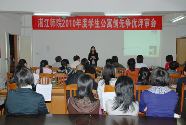 湛师新闻网12月4日讯 昨晚,由我校学生工作部主办、学生公寓管理中心、各二级学院学工办承办及学生公寓管理协会协办的2010年度学生公寓创先争优评审会在尚德苑文化活动室举行。学生处钟莉萍副处长,各二级学院学工办副主任及辅导员,学生公寓管理中心四位主任与管理老师,学生公寓管理协会学生干部代表参加了评审会。会议由钟莉萍副处长主持。