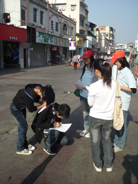 针对频繁发生的交通事故,志愿者们在烈日炎炎的情况下,走到人流较多的地方了解人们的交通安全认识。在调查过程中,群众都积极配合此次活动,他们都表示这种调查活动不仅提高了人们的交通意识,而且能加强大学生与他们间的交流。在问及“您是否冲红灯?”、“您是否觉得湛江的交通应该改善?”、“您是否对交通安全法了解?”等问题时,大部分群众认为湛江应该建立健全的交通法律法规,增加“红绿灯”的数量,严重整顿交通秩序。通过这些问题的调查,志愿者们发现人们对交通法的认识甚少,交通意识淡薄。