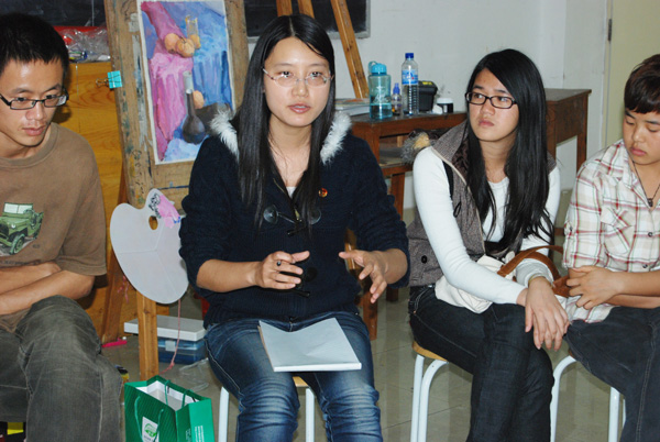 当天下午,由美术学院辅导员黄钰晶老师以一名学生干部的身份策划的“责任与思维”主题班会在咏雷楼103室举行,美术学院09级和10级各专业中来自不同省份的学生代表参与了本次主题班会。在室外进行的互动游戏中,黄钰晶老师与同学们互相进行自我介绍,让来自不同专业和不同省份的同学互相之间增进了了解。其后进行的唱歌、介绍家乡风土人情等游戏活动让师生都乐在其中,现场气氛十分活跃。