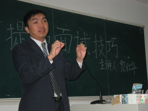 湛师新闻网11月28日讯 为了提高在校大学生的应聘能力和求职技巧,增强其社会竞争力,昨晚,我校招生与就业处在弘雷楼305室举行了“2010年大学生就业实训月系列活动”讲座之——“如何提高面试技巧”讲座。实战派营销培训专家、国家执业律师、香港福生生珠宝有限公司和深圳卡天尼珠宝有限公司总经理黎红华担任了本次讲座的主讲嘉宾。