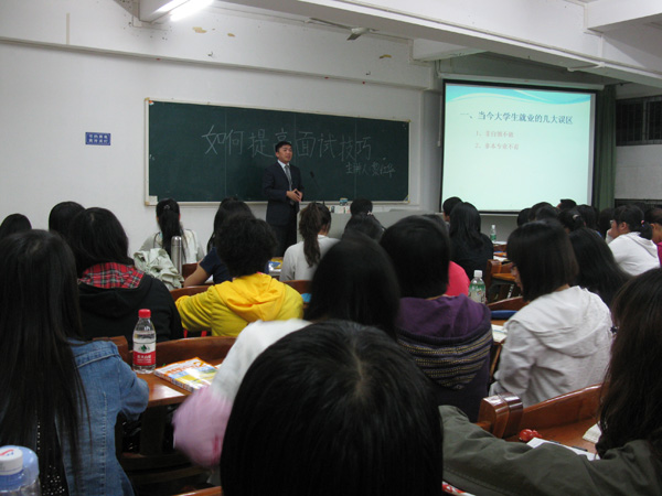讲座过程中,黎老师主要围绕当今大学生的就业误区、面试成功的准备条件、常见的面试问题及面试后等四个方面展开演讲。首先,他指出,当今大学生在就业过程中对自身的就业定位过高,存在非白领不做、非本专业不看、非高薪不瞧、非大型企业和非大城市不去等几大就业误区,并提醒同学们要懂得放远目光看形势。接着,他着重阐述了面试成功的必备条件和分析了一些常见的面试问题及面试后的一些细节问题,指出了面试要有充分的准备、明确的目标、较强的沟通能力和诚信的态度,进一步增强了同学们的面试信心。最后,他提醒同学们要清楚自己的职业方向,做好自身的职业行业选择和端正职业态度。