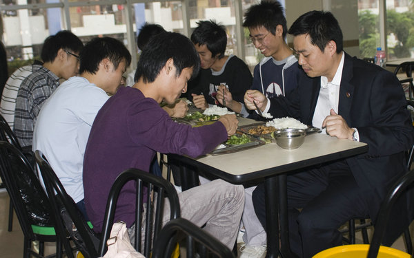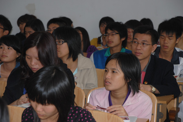 李发武副书记今天也同样与学生打成了一片。在“舍友们”的带领下,李副书记一早就来到了榕燕楼105室,聆听由数科院党委吴华明书记主讲的两节高等代数课,副书记亲切感受到与同学们一样起立叫“老师好”的大学时光。他与同学们一起专心听课,认真思考,切身感受现代青年学生追求知识的过程。课后,他表示自己深深地折服于老师上课时所表现出的魅力,并相信同学们也是有着切身体会。中午时分,李副书记和另一位专职团干部黄展老师与学生约定在鹏园饭堂聚餐,10多名学生与老师们边吃边聊,度过了一个快乐的午餐时间。晚上,在李副书记的带动下,2010级数本1班2班的同学们与学校的教职工们进行了一场篮球友谊赛,比赛于8点在灯光球场附近开赛。黄展老师带领着同学们在一旁呐喊助威,真实地融入到了学生的角色中。